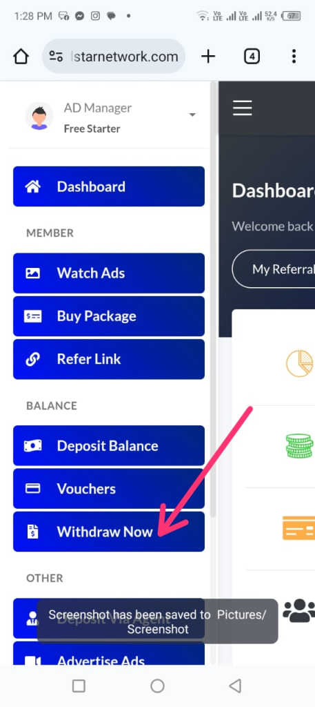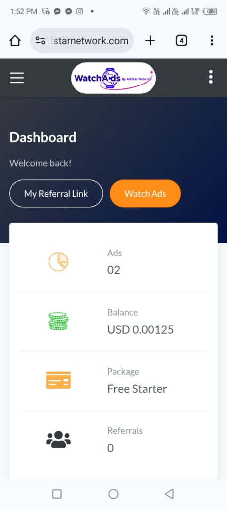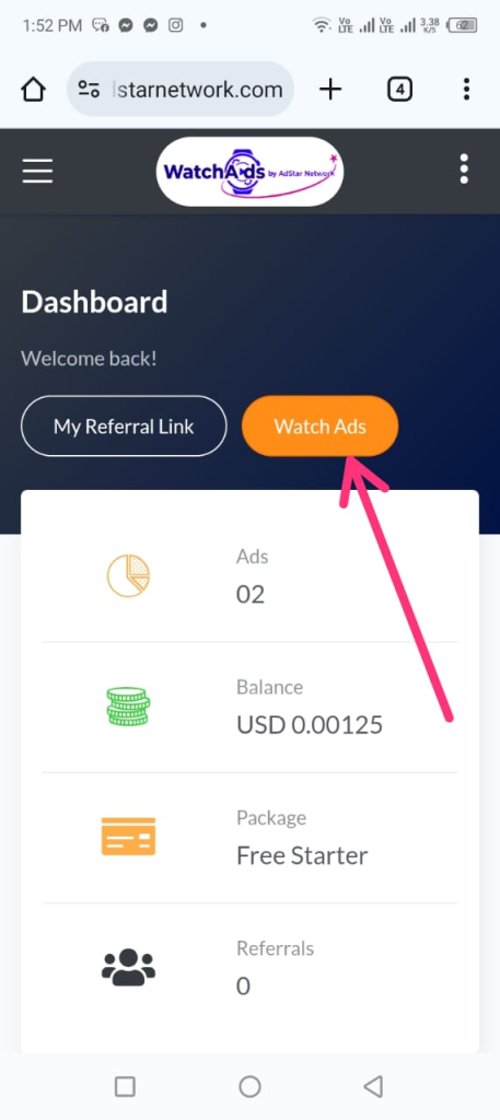 After Click On Confirm Purchase, You Will be Seen Like This Your Account DashBoard With Ready To Watch Ads & Earn Dollars and Your Referal Link Button to Copy Referal Link and Invite New Members