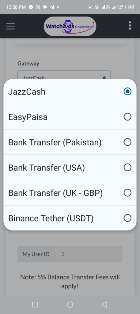 Select Your Payment Method Gateway , as JazaCash, Easy Paisa, Bank Transfer or Binance and Deposit at Least(FIVE USA Dollars)$5/Pkr 1405(Equal to Current Pakistani Ruppees Rs. Fourteen Hundreed & Five Rupees) For Basic Package Activation fees Through any One Of Our Local & International Payment Options. 1- Easy Paisa Account 03462138294